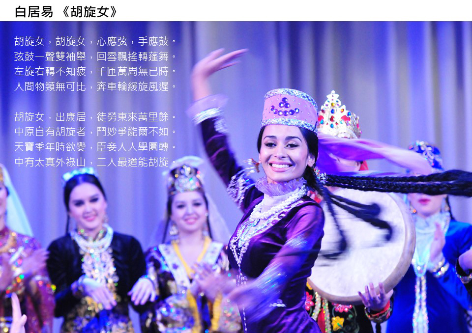 眾所周知,大唐盛世時與「西域」國家的交流非常頻繁,無論是宮廷或民間都吹起一股「哈胡風」。唐朝宮廷樂舞中的「十部伎」中就有五種來自「西域」,即高昌樂、龜茲樂、疏勒樂、康國樂、安國樂,就是來自今天的新疆(吐魯番、阿克蘇、喀什)及中亞地區(撒馬爾干、布哈拉一帶)。當時流行的舞蹈也包含大量的「西域」舞蹈,例如屬於「健舞」類的胡旋舞、胡騰舞、柘枝舞等,這些流傳千年的樂舞至今仍活躍於舞台表演中,綻放無比的絲路風彩。